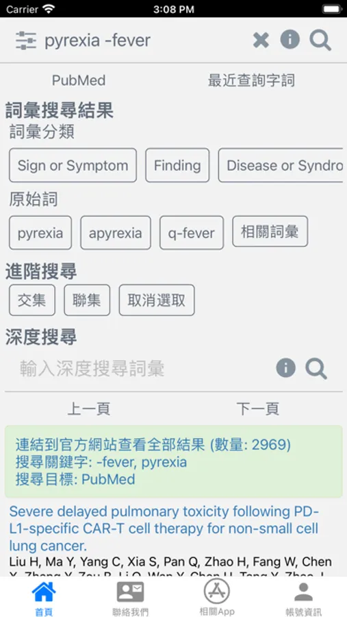 ・相似搜尋功能:自動轉換不同的詞性,並自動萃取使用者輸入可能包含的片語,提供完整的相關醫學專業詞彙。