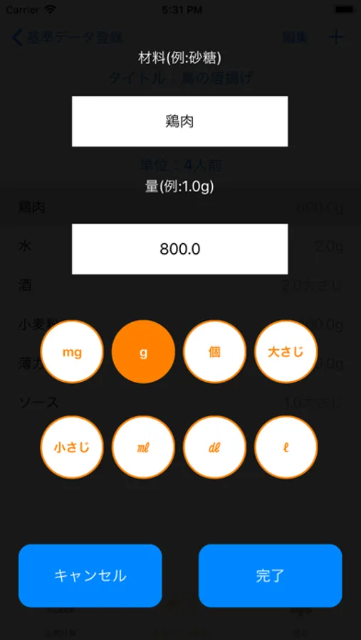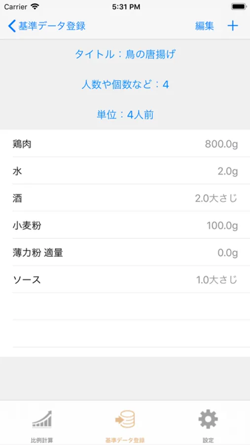 料理の成分の基準量を登録し、比例計算させられるアプリです。例えば、基準量が五人分で表示されていた場合、7人分の量を求めたいときにこのアプリを使えば瞬時に計算させられます。