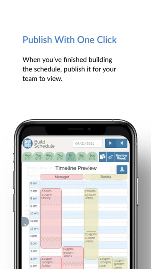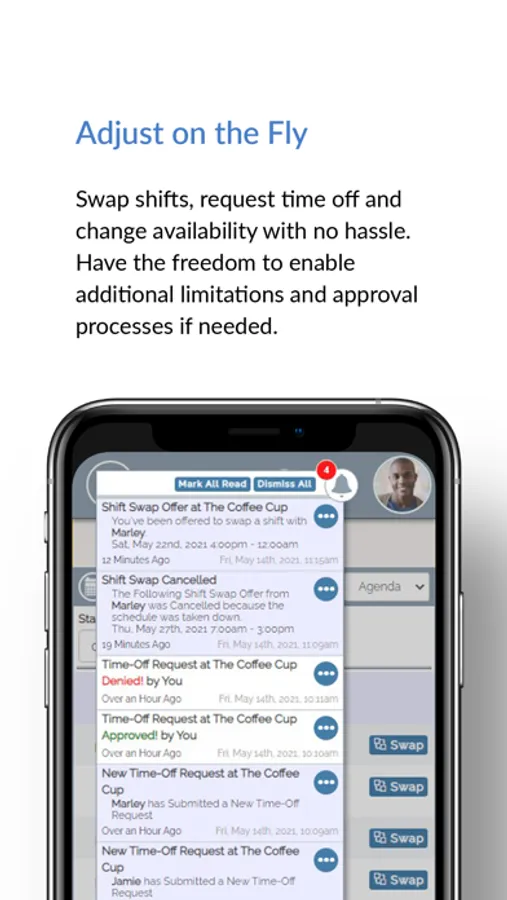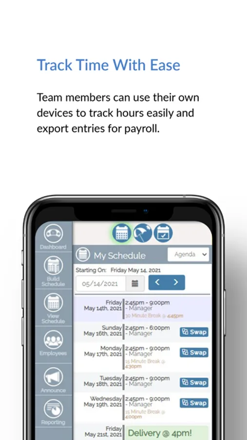 • Streamline communication with automatic notification options for new schedules, time off requests, shift swapping, shift reminders, and more