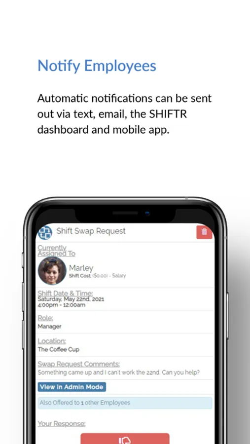 • Notifications are available via text, email, app push notifications, and the SHIFTR dashboard