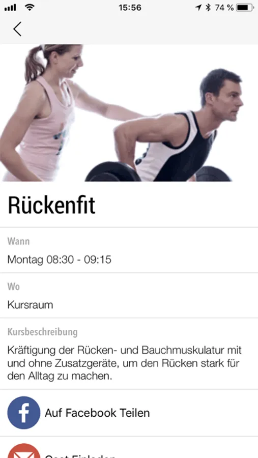 Direkter und aktueller Zugriff auf den Kursplan von überall: Für jeden Kurs kannst Du Details wie Zeit, Kursbeschreibung, Raum und Merkmale wie z.B. den Schwierigkeitsgrad einsehen.