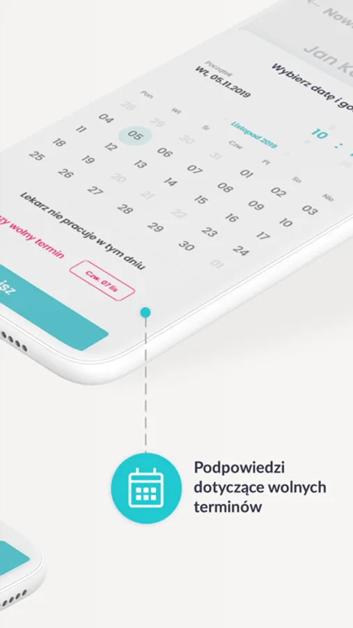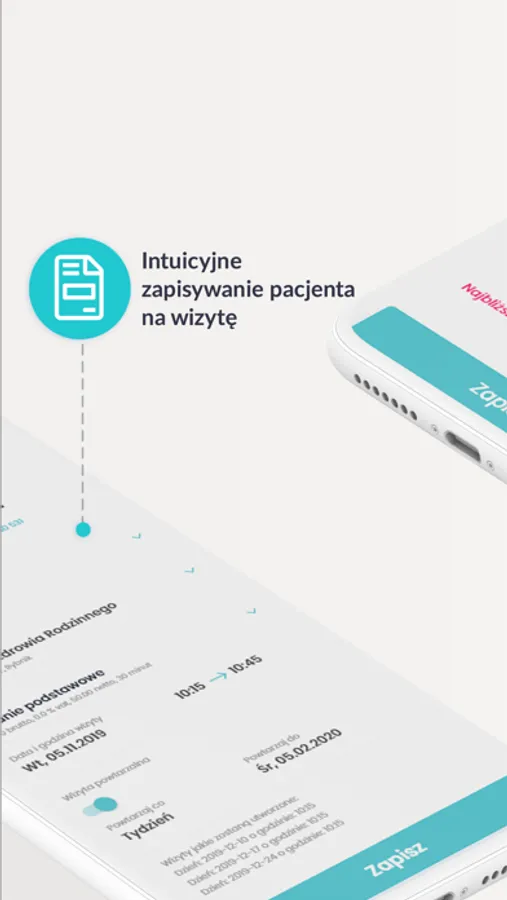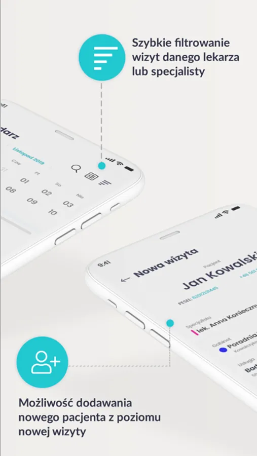 Aplikacja mobilna zainstalowana na telefonie monitoruje pracę całego gabinetu. To rozwiązanie, dzięki któremu z pewnością zwiększy się ilość pacjentów na wizytach, ponieważ w łatwy i przejrzysty sposób można sprawdzać wolne godziny przyjęć, zapisywać pacjentów na konsultacje czy odwoływać wizyty.