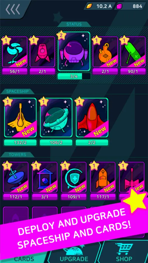 ● Build your own strategy by combining spaceship and tower cards