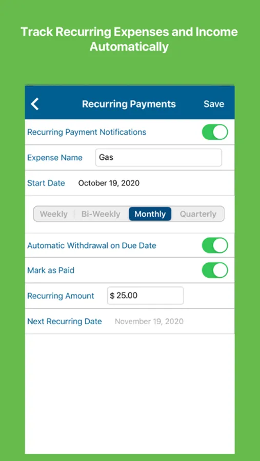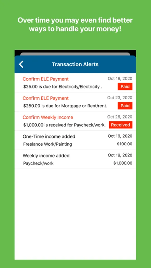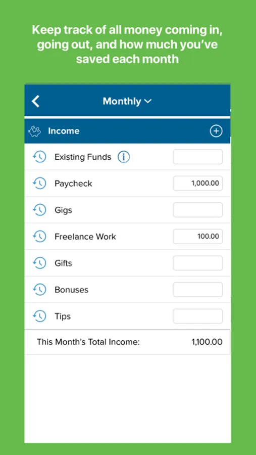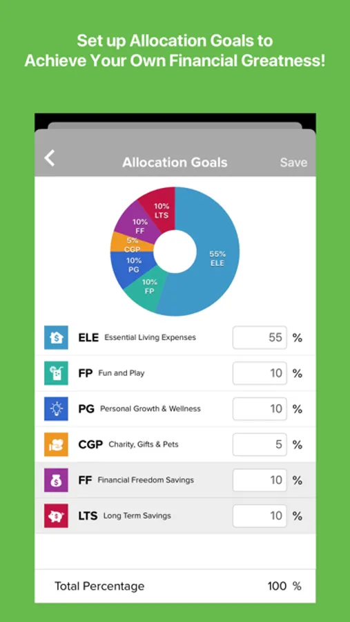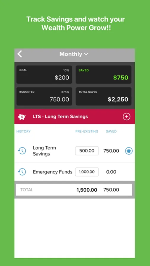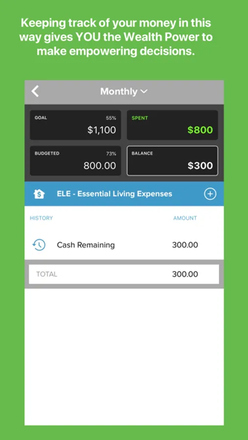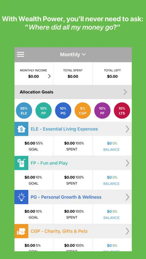 The easiest way to use this app is to start out by entering your paycheck. Then enter all your income and expenses as you go. You can receive reminders on your phone when a reoccurring expense is due! You can set categorized budgets and set your Wealth Power goals to help you save each month!