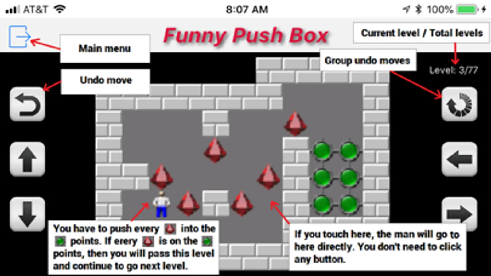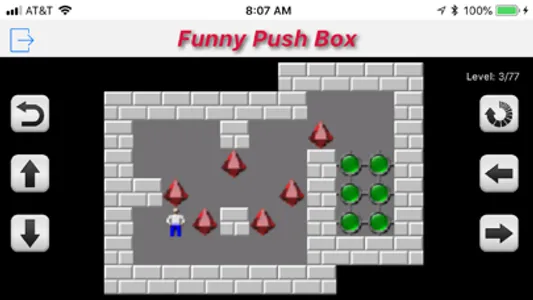 The player is confined to the board, and may move horizontally or vertically onto empty squares (never through walls or boxes). The player can also move into a box, which pushes it into the square beyond. Boxes may not be pushed into other boxes or walls, and they cannot be pulled. The puzzle is solved when all boxes are at storage locations.