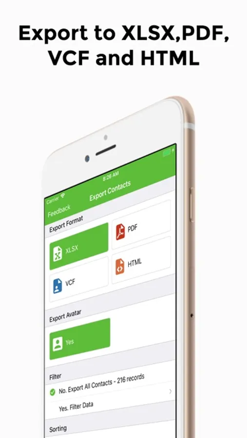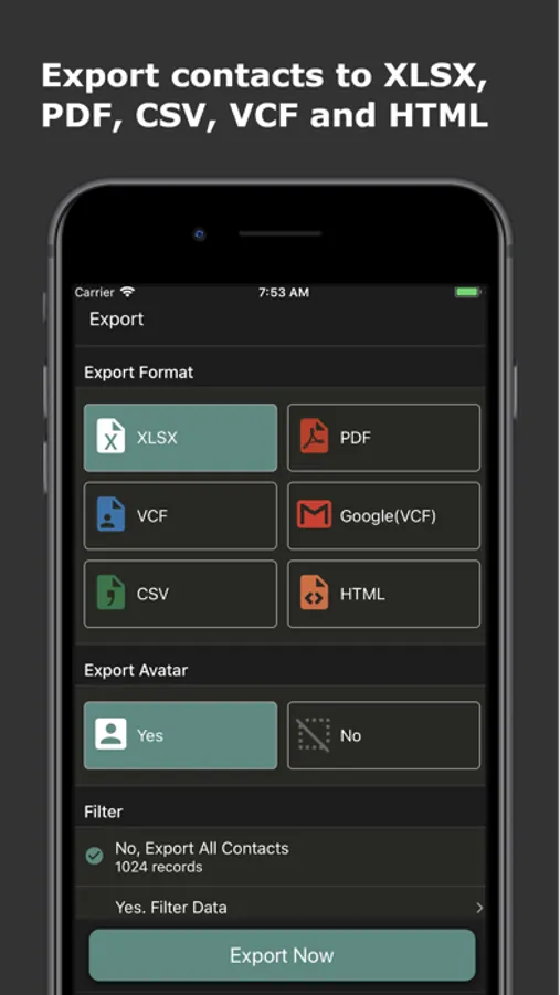 Export contacts with photos to XLSX, PDF, VCF, CSV and HTML. Very easy to use by clicking Export Now.