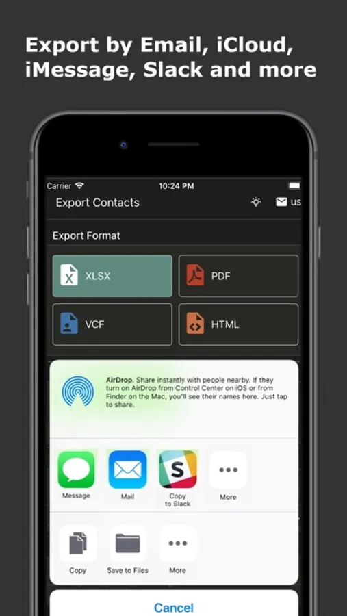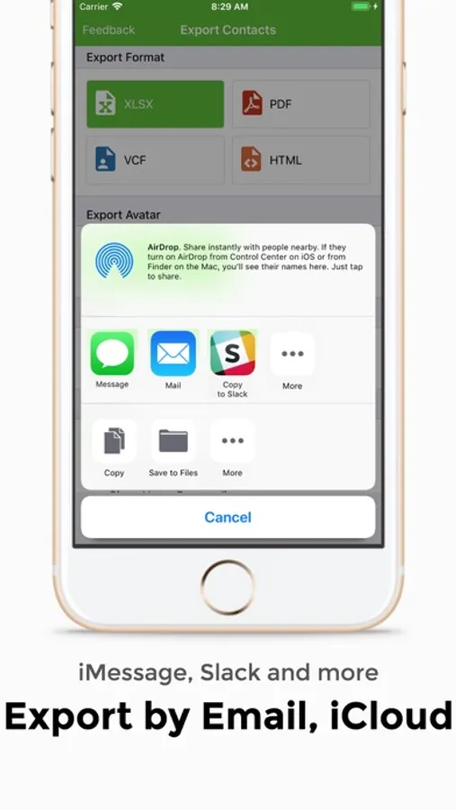Send exported file by using iMessage, Email, iCloud, Slack, AirDop, Google Drive, Dropbox and others.