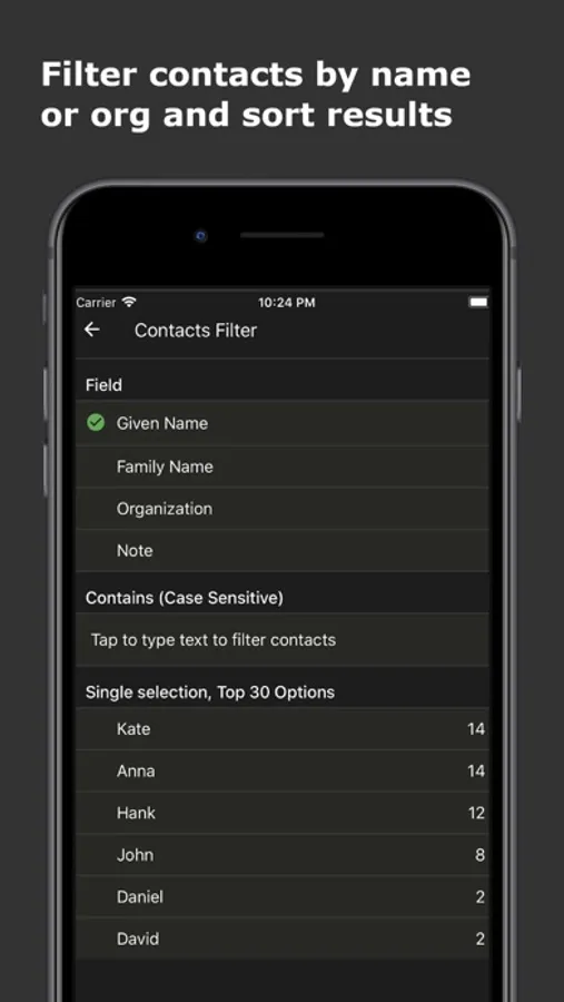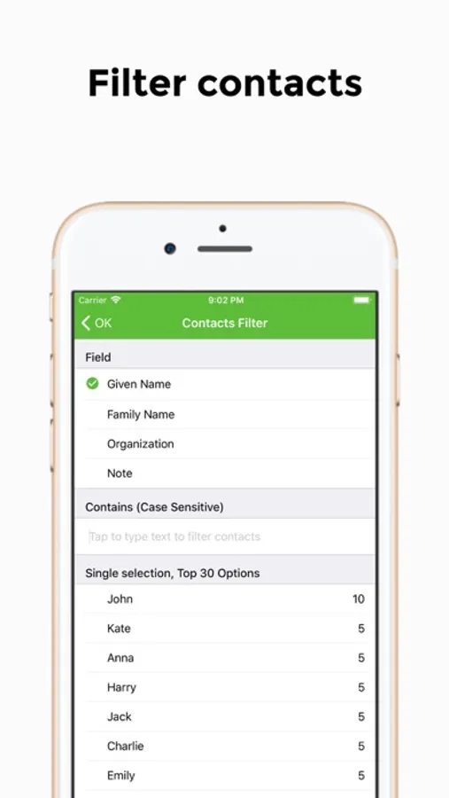 Default option is export all contacts, you can add filter to find contacts that contain target text.