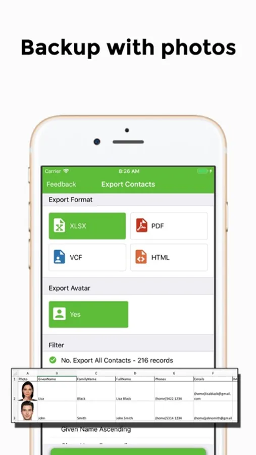 Backup your contacts with photos(pictures). Photos in XLSX may not be visible in some tools, please use Excel to read XLSX.