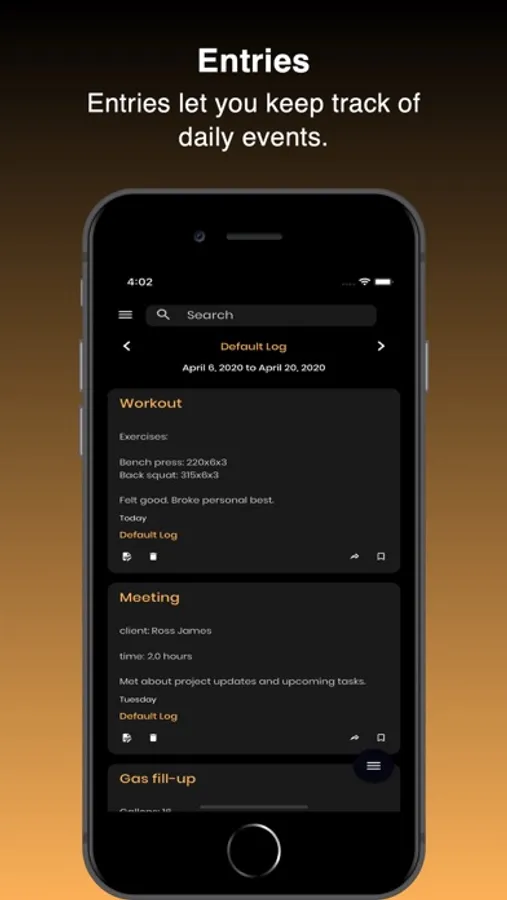 New Entries: Adding a new entry is a snap with the template feature. Create templates for common entry types and add them with just a few taps. For example, keeping track of exercise days or appointments. A set template helps you to create a new entry using a set form so that each entry is consistent.