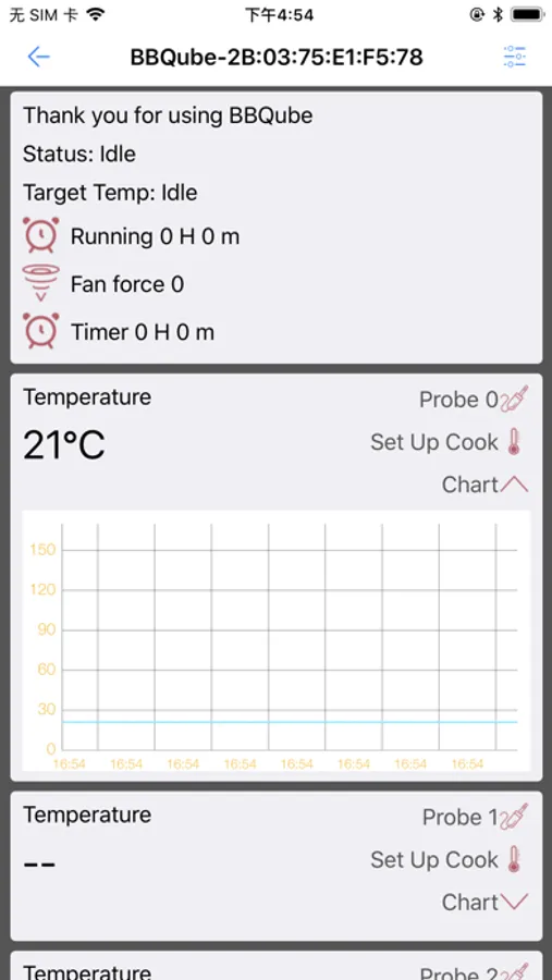 Connect to your BBQube TempMaster Pro via this simple and intuitive app. You can monitor all four probes simultaneously with trending charts and presets for alarms. Other monitoring data includes device status, running time, and fan power level. If you're disconnected from the controller. Restart the app to connect again. Each BBQube TempMaster Pro device will be displayed with its unique MAC address in the app. Temperature data can be exported into spreadsheet via airdrop.