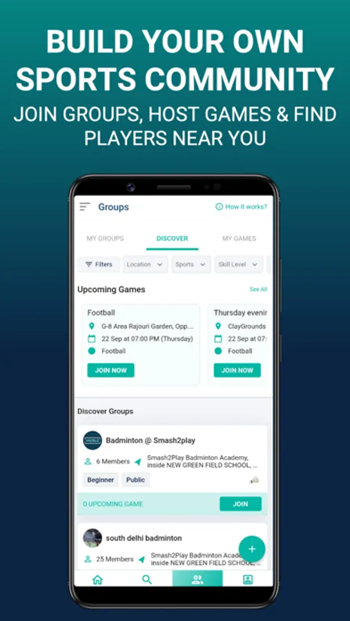 Left alone to play your favourite sport? No worries, Hudle groups allow you to connect with players near you. Get on the ground with just three simple steps - Find, Join, Play and build your very own sports community.