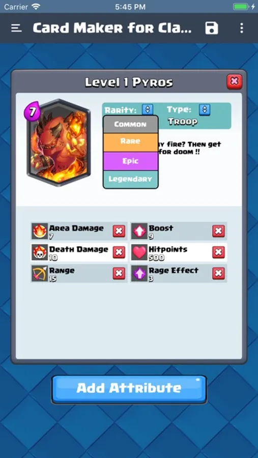 Card Maker for CR is just a design tool and no way affiliated with or endorsed by Supercell. CR content and materials are trademarks and copyrights of Supercell. For more information, see Supercell's Fan Content Policy http://supercell.com/en/fan-content-policy/