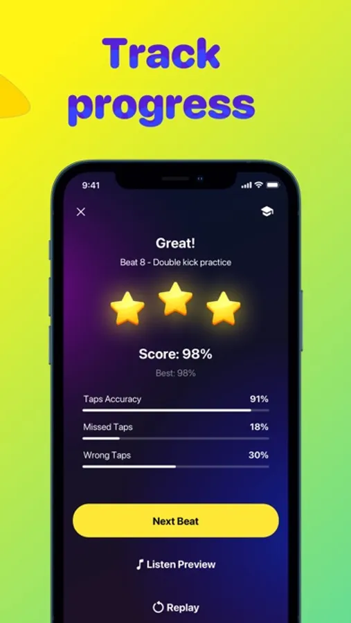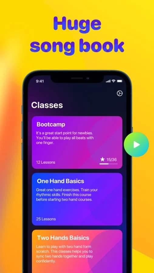 * Different modes: use tutorial mode to watch how to play the lesson. Use step-by-step mode to learn the rhythm. Use live mode to challenge yourself.