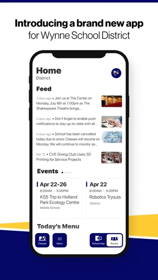 The event section shows a list of events throughout the district. Users can add an event to your calendar to share the event with friends and family with one tap.