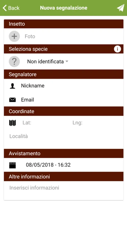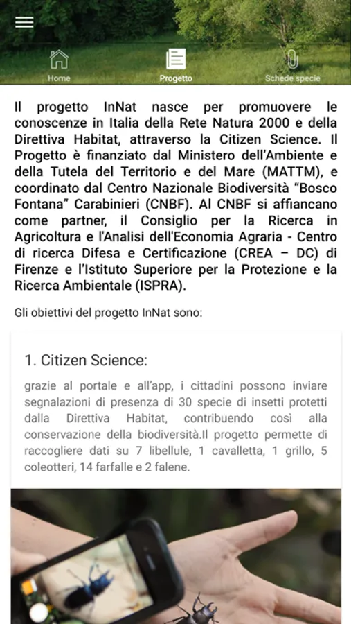 Il progetto InNat nasce per promuovere le conoscenze in Italia della Rete Natura 2000 e della Direttiva Habitat, utilizzando l’innovativo strumento della Citizen Science. Attraverso l’app InNat sarà possibile inviare e visualizzare dati faunistici raccolti dai cittadini relativi alla presenza di 30 specie di insetti, inclusi negli allegati II e/o IV della Direttiva Habitat e perciò protetti a livello Europeo. Si tratta di 7 libellule, 1 cavalletta, 1 grillo, 5 coleotteri, 14 farfalle e 2 falene.