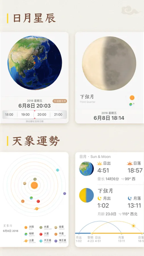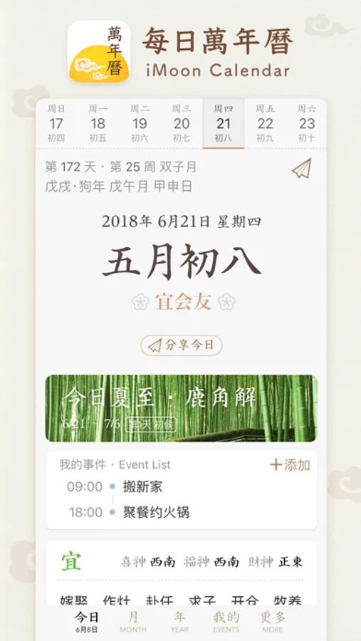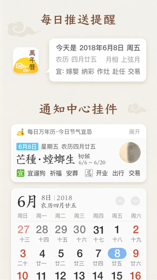 · 推送提醒:每日宜忌、事件、日月出落推送