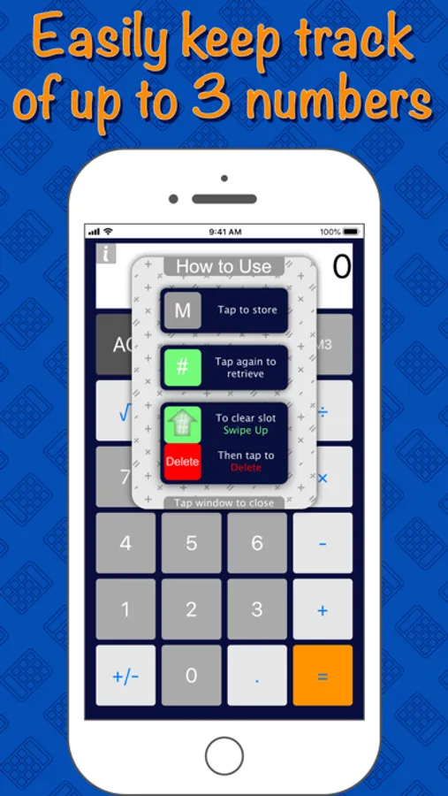 Simply tap a memory slot to store a number and tap it again to retrieve a stored number unlimited times. When you ready to clear a memory slot, swipe up on that slot and tap Delete.