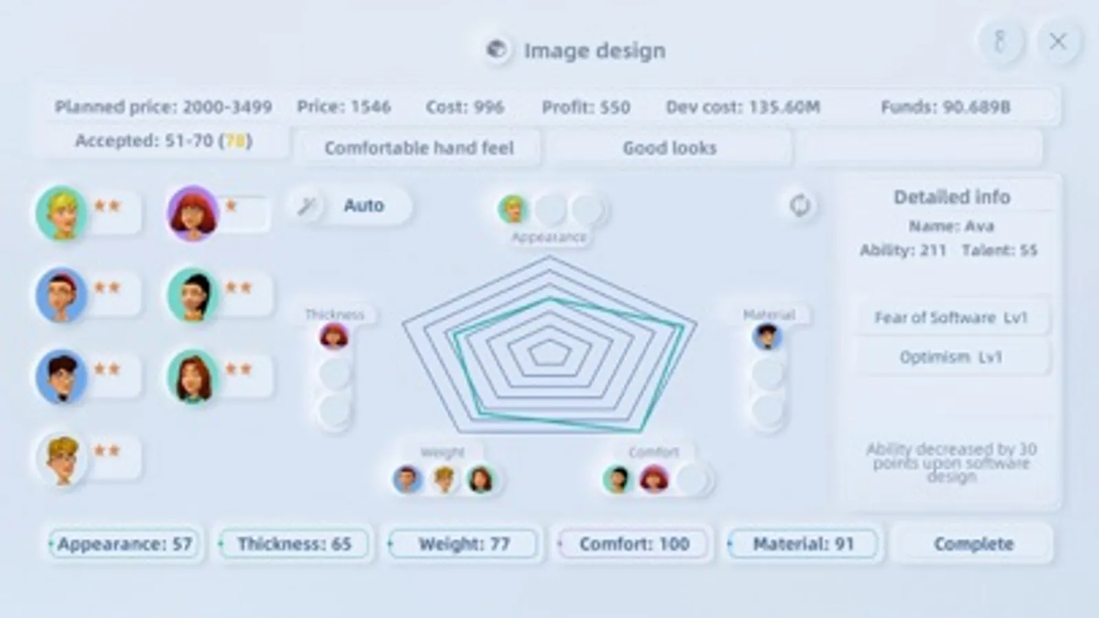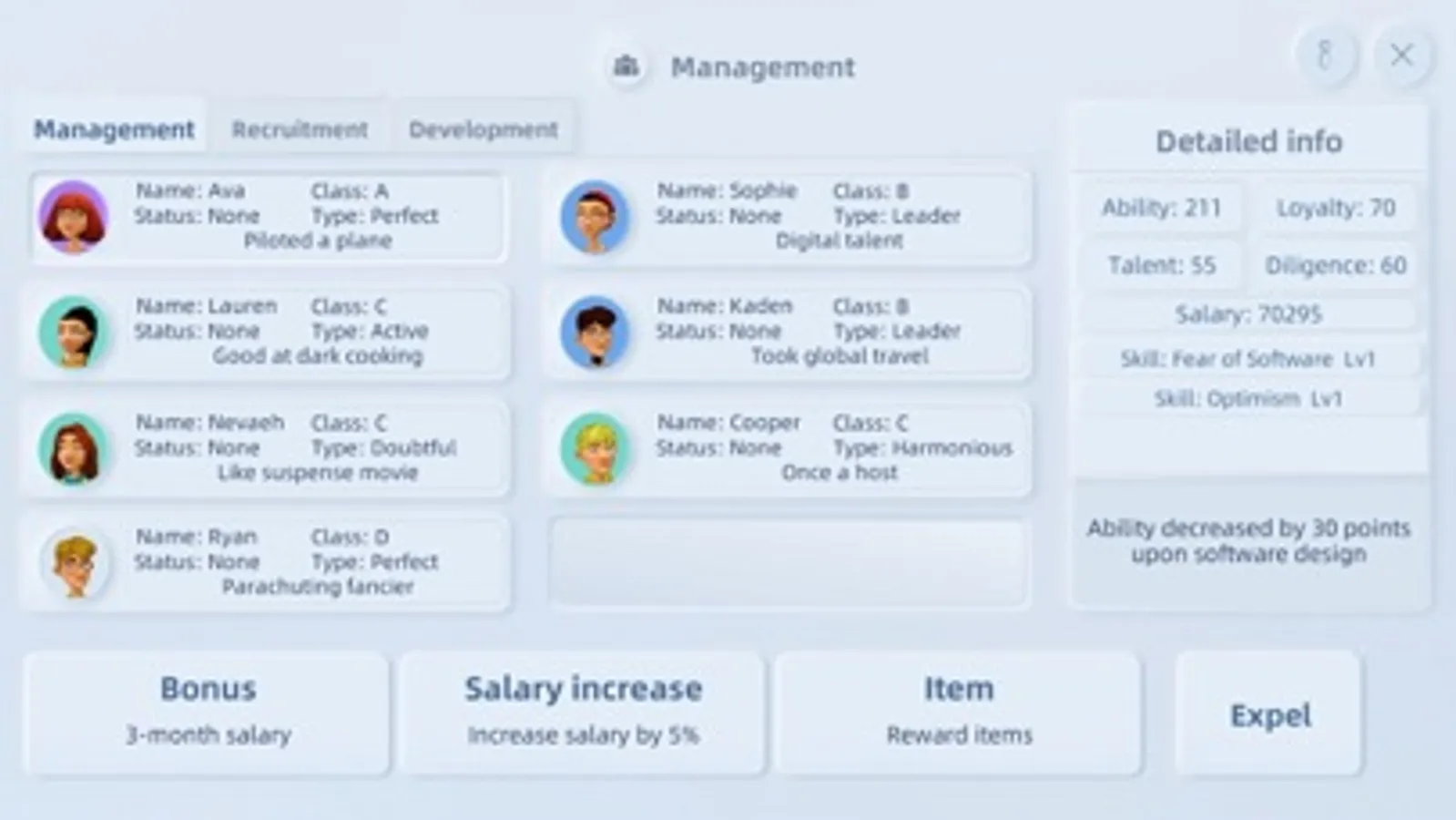 In order to simulate a real business environment, lots of competitors will be constantly updated. Players may cooperate with them for joint development or poach talents from them.