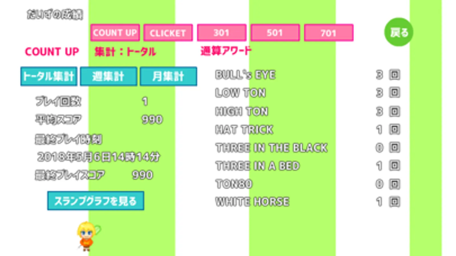 ダーツ上達に欠かせないスコア記録とスランプグラフ機能を搭載。