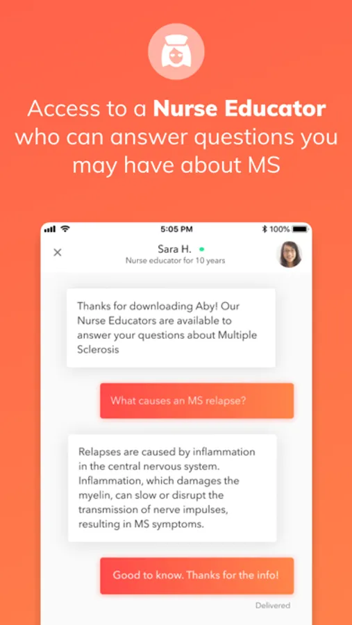 Connect with Nurse Educators who have extensive knowledge of MS, directly in the app. While your healthcare team should be your primary source of information for any questions or concerns you may have, our Nurse Educators are also available to answer your MS-related questions.