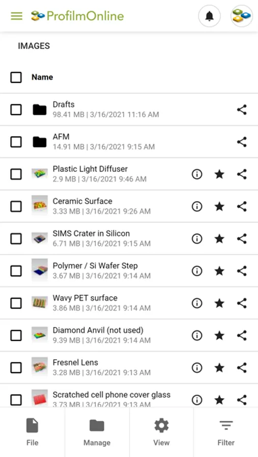 ProfilmOnline lets you store, share, view, and analyze 3D images. Profilometers, AFMs, and other 3D microscopes produce surface topography and other related images which can be uploaded to your private gallery. You can view and analyze your images, quickly and easily share them with others, and view images shared by others. ProfilmOnline includes sophisticated image processing operators to perform functions such as filtering noise, eliminating defects, leveling, cropping, and others. It also includes analysis modes such as step height, roughness, cross-section, dimension, and volume.