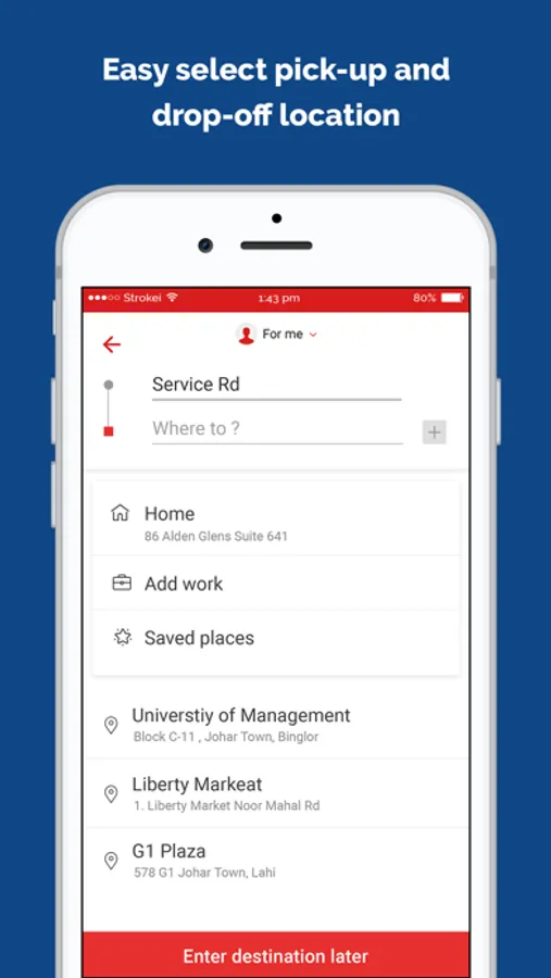 Set your destination, right on the map, where you want to go within the town and you will be notified about those rides only heading towards your destination.