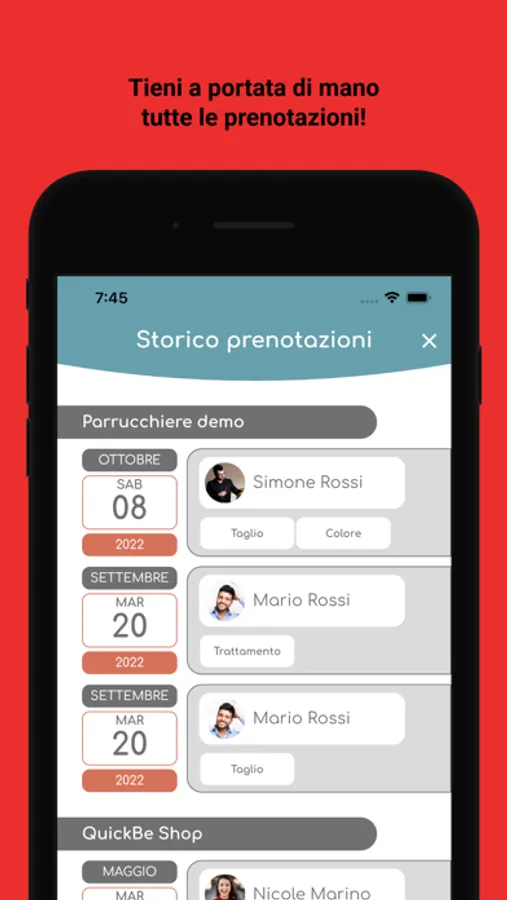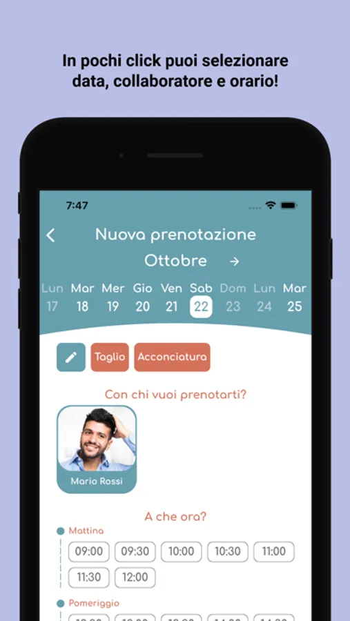 Prenotazioni online! Scegli con chi vuoi tagliarti i capelli, la data e l'ora, tutto con pochi e semplici tap.