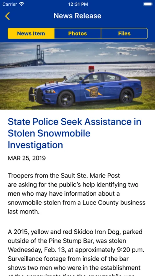 The Michigan State Police (MSP) mobile app was designed to give you a direct connection to your local MSP post. Follow the post that serves your community to receive instant notification of traffic crashes, arrests, criminal investigations, community events, education and prevention information, and crime trends impacting your area.