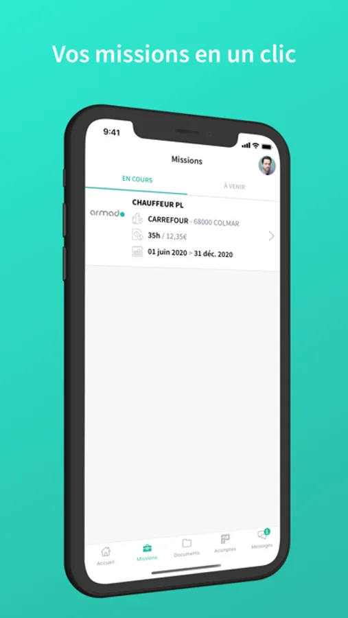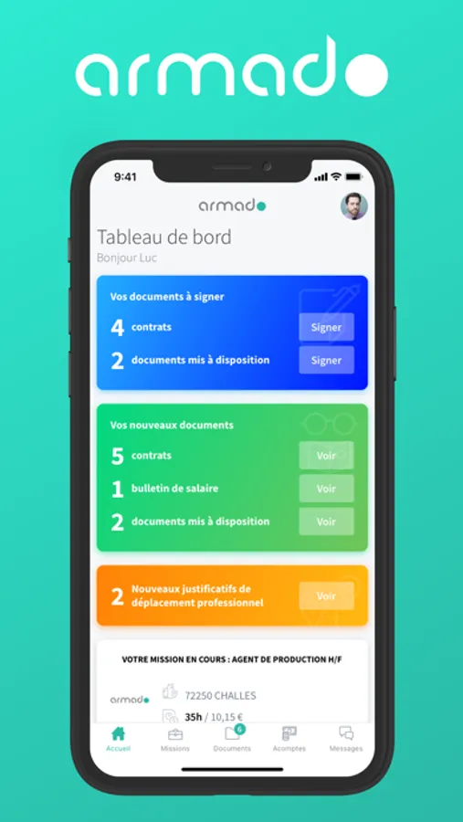 Connectez-vous à votre espace personnel Armado et recevez sur votre appli l'ensemble des documents administratifs de vos missions d'intérim (contrats, bulletins de salaires...).