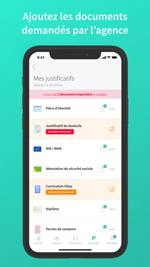 → Ajoutez les documents administratifs demandés par votre agence (CV, diplôme, permis, ...)
