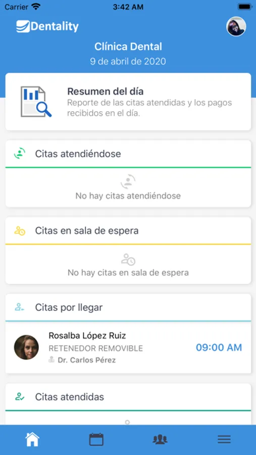 uno de los dentistas, así como el número de pacientes que se encuentran en la sala de espera.