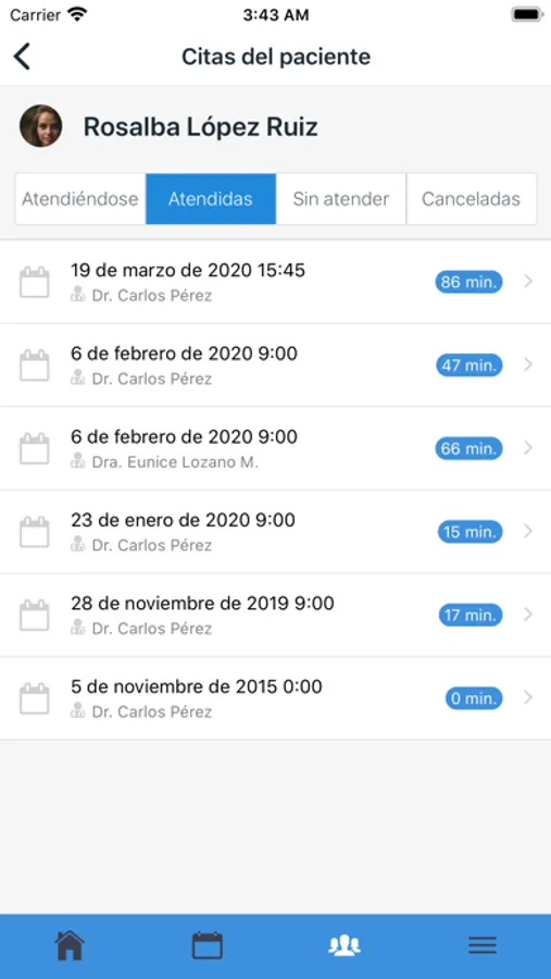 - Control de citas. Registra, da seguimiento o cancela las citas de tus pacientes. El administrador podrá visualizar rápidamente los pacientes que están siendo atendidos en el momento por cada