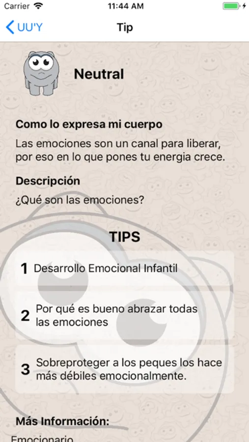 Descubre diferentes personajes que con sus expresiones, colores, y formas ayudarán a tu peque a conocer y crear un vocabulario más extenso de la gama de emociones que existen. Da click en cada personaje … encontrarás su descripción, como se siente físicamente y 3 tips prácticos para encaminarlas; además te compartimos links a información más amplia de diferentes autores y temas relacionados.