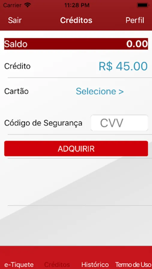 Depois do cadastro efetuado, o usuário poderá adquirir créditos para compra dos e-Tíquetes, utilizando seu cartão crédito ou débito. No APP poderá visualizar o histórico das aquisição de crédito realizadas no EstacionamentoFacil, além de ter sempre a mão seu Saldo para compra de novos e-Tíquetes.