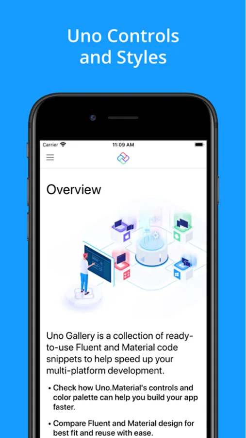 This application showcases a playground for testing XAML code live, and the view the features of Uno platform library for iOS.