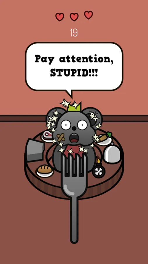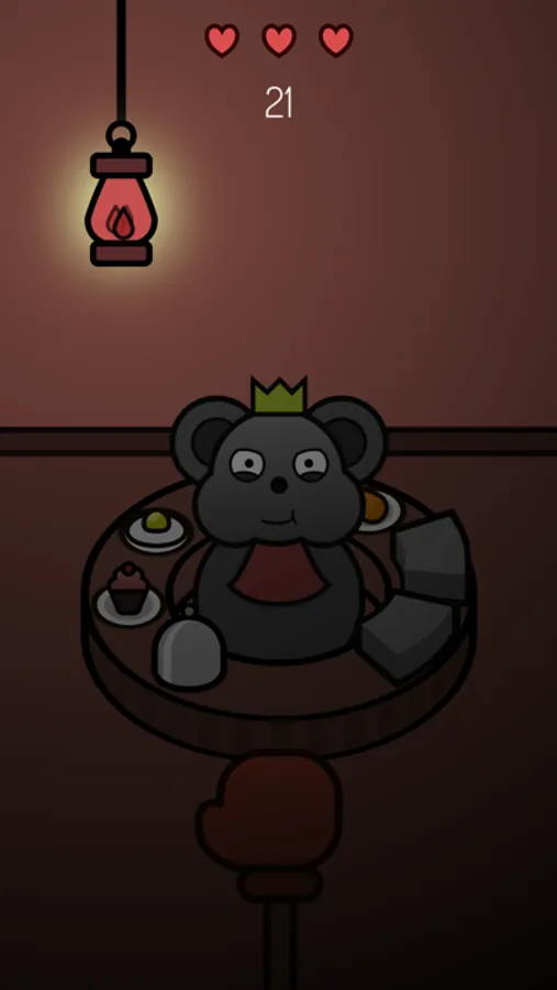 Well, it seems easy, right? Wait for the rotating table to set, and when the food is in front of you, touch the phone screen! Of course, there is always something unexpected in this work, for example sometimes the table rotates too quickly, or some assassin hired by King Kitten has exchanged some chicken thigh with explosive bombs ... Or someone turned off the light during the banquet ... But the harder obstacle is surely the talk of King Roden: can you bear it without punching his face? I bet no!