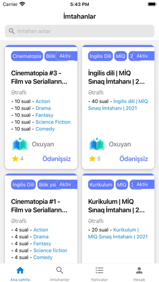 - Hansı növ imtahanı vermək istədiyindən aslı olmayaraq Oxuyanın öz istifadəçiləri üçün təmin etdiyi bir çox imtahanlardan özünüzə uyğun olanını tap və özünü sına!