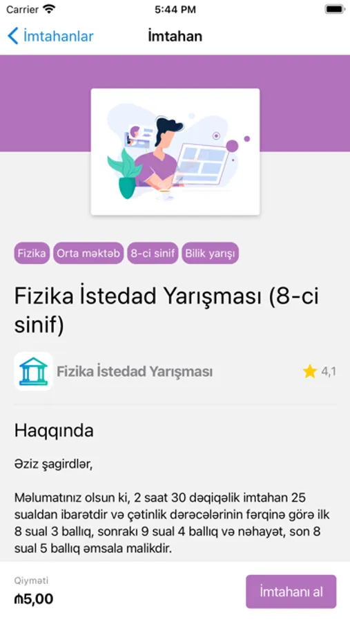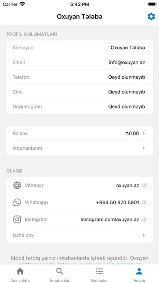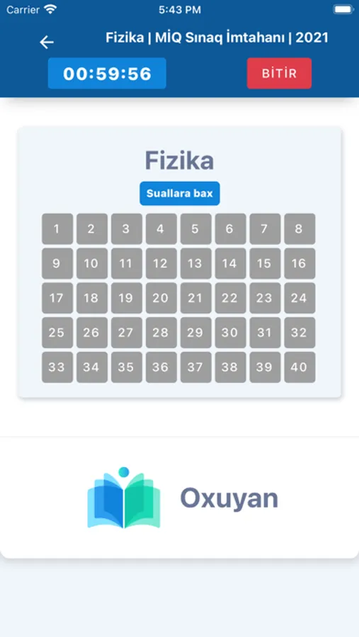 Oxuyan istənilən növ imtahanların təşkili üçün yaradılmış müasir platformadır. Bu onlayn imtahan platformasının təmin etdiyi mobil applikasiya vasitəsilə istənilən zaman rahatlıqla imtahanlara qoşulmaq mümkündür. Bizimlə obyektiv, rahat və sürətli imtahan təcrübəsindən zövq al!