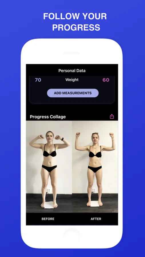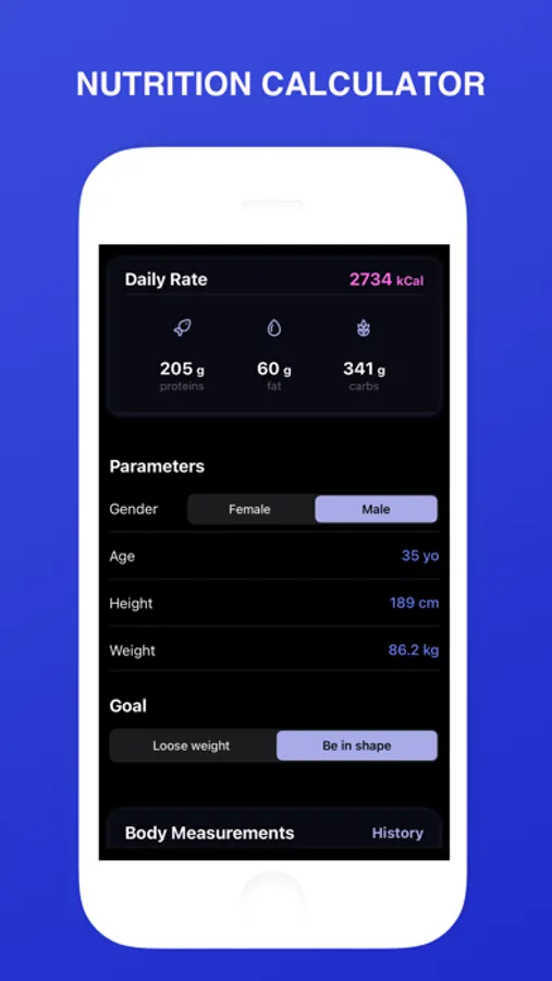 With us, you'll be getting one step closer to your goal every day - a beautiful body! Control nutrition, check your steps and water intake, monitor your progress by making measurements, and saving before/after pictures. Get your nutrition recommendations.