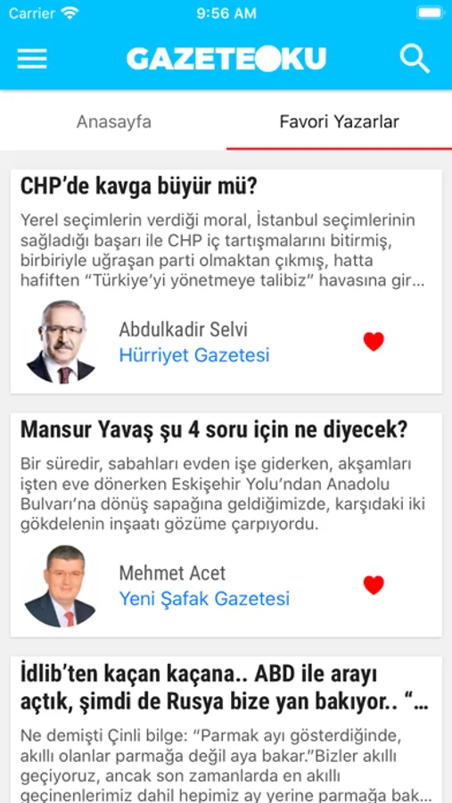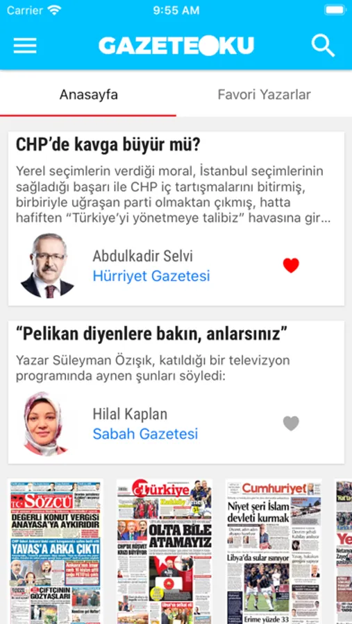 GazeteOku uygulaması ile tüm yazarların makalelerini okuyabilir, sevdiğiniz yazarları favorilerinize ekleyerek yazılarına kolayca ulaşabilir, yazarları gazetelere göre filtreleyebilirsiniz.