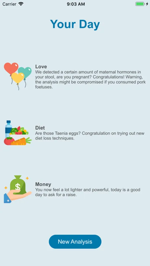 How does it work? It's simple, just take a picture of your stool and let the app compute all the data, and present you your horoscope of the day. Because the process can be very compute intensive, we recommend using a recent version of iOS to make the process faster.