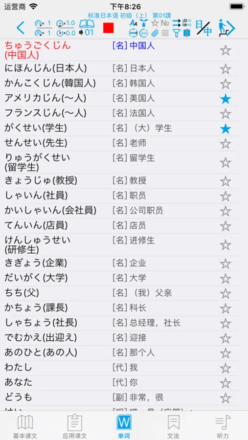 ⑦练习模块:通过顶部的[练习]按钮,您可以切换到单词的练习模块。本APP集成了“中文→日文”、”日文→中文“、”日文→语音”,“听说比对” ,“单词拼写”等(以下)五个练习模块。(※ 1,※ 2,※ 3)
