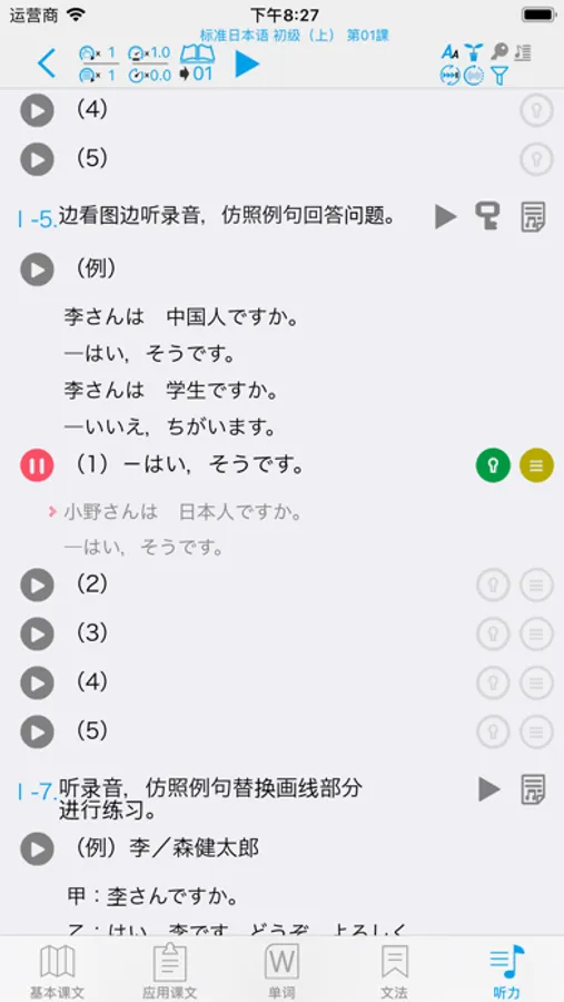 ⑥ 如果在设置中打开后台播放功能(默认打开),就可以让您设置的复读声音进行后台播放。您可以通过耳机的线控进行停止/继续,在有在连课的时候,更能通过线控进行切课。(单击2次换下一课,单击3次换前一课,单击一次播放/暂停。)