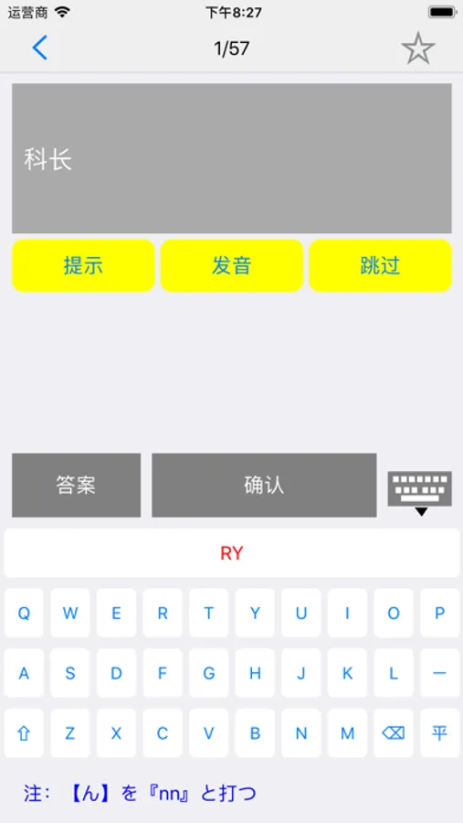 e. “单词拼写” 练习:通过提示的中文,通过键盘(kana或罗马字)拼写出假名。