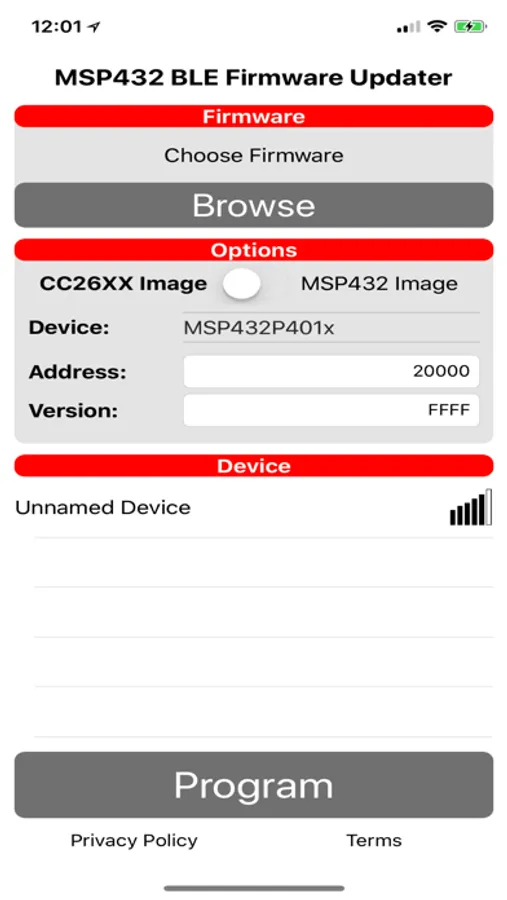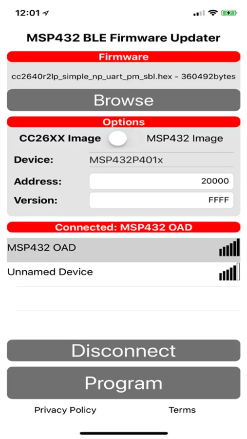 The MSP432 BLE Firmware Updater is a lean and powerful mobile application that will perform an over-the-air download (OAD) of the firmware image running on you MSP432P4 device. In addition to having the ability to update the firmware running on the MSP432, the MSP432 BLE Firmware Updater can also update the firmware of the attached SNP device (CC26XX).