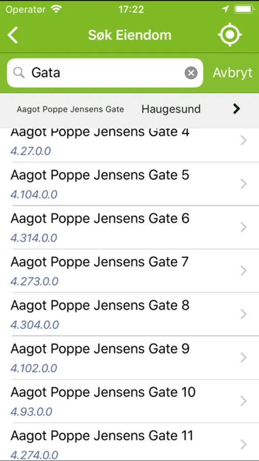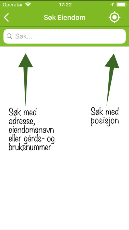 Eiendom velges enten ved å søke på adresse eller ved hjelp av GPS-posisjon.