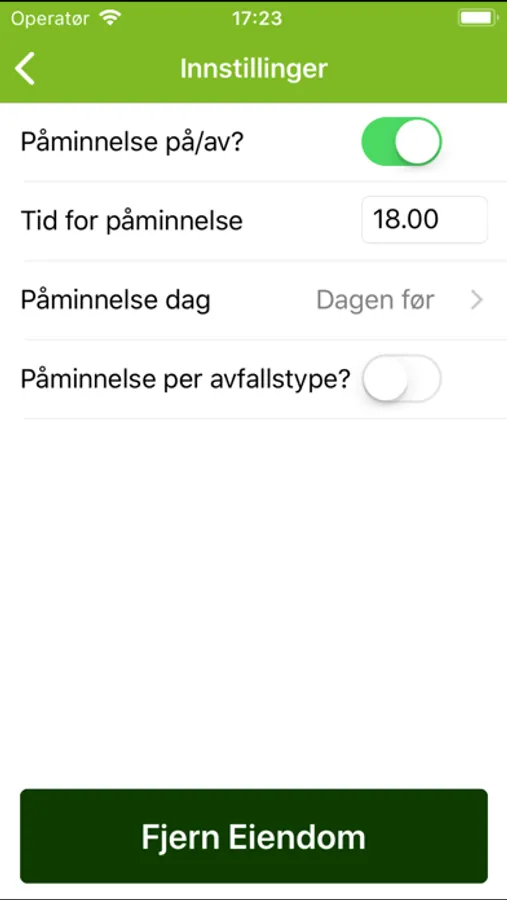 Tømmeplanen viser tidspunkt for hvilke typer avfall som skal tømmes når for valgte eiendom. Varsling dagen før tømmedag blir automatisk satt, men kan endres i innstillingene. Det kan du endre tidspunkt for varsling og om du ønsker kun varsling for vises avfallstyper. Appen vil også gi riktig dag for tømming ved innkjøringer, f.eks. i forbindelse med bevegelige helligdager.