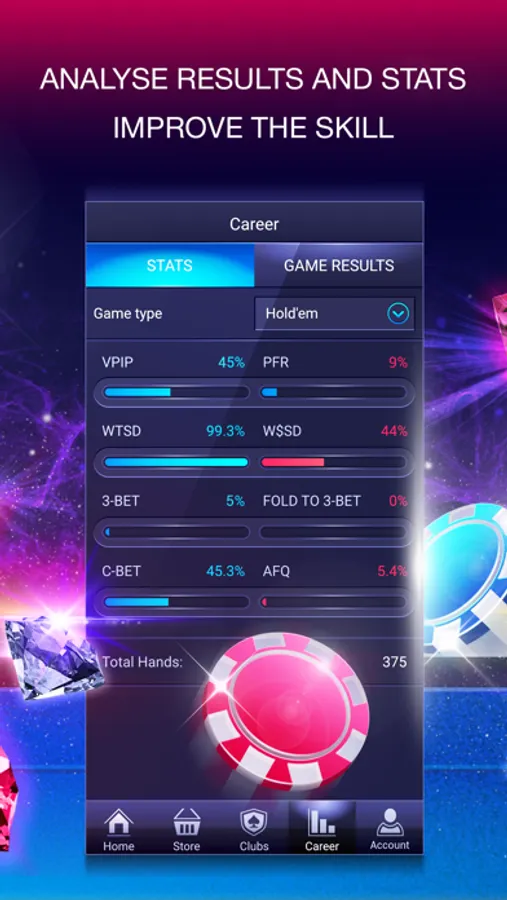 Play exciting poker games with friends, colleagues, offline club members! All popular types of poker games are available – Holdem, Omaha, OFC, OFC Pineapple, Stud, and others.