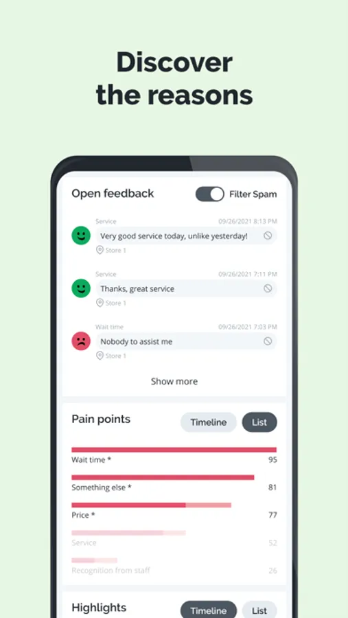 - Discover the reasons through open feedback, painpoints, and highlights